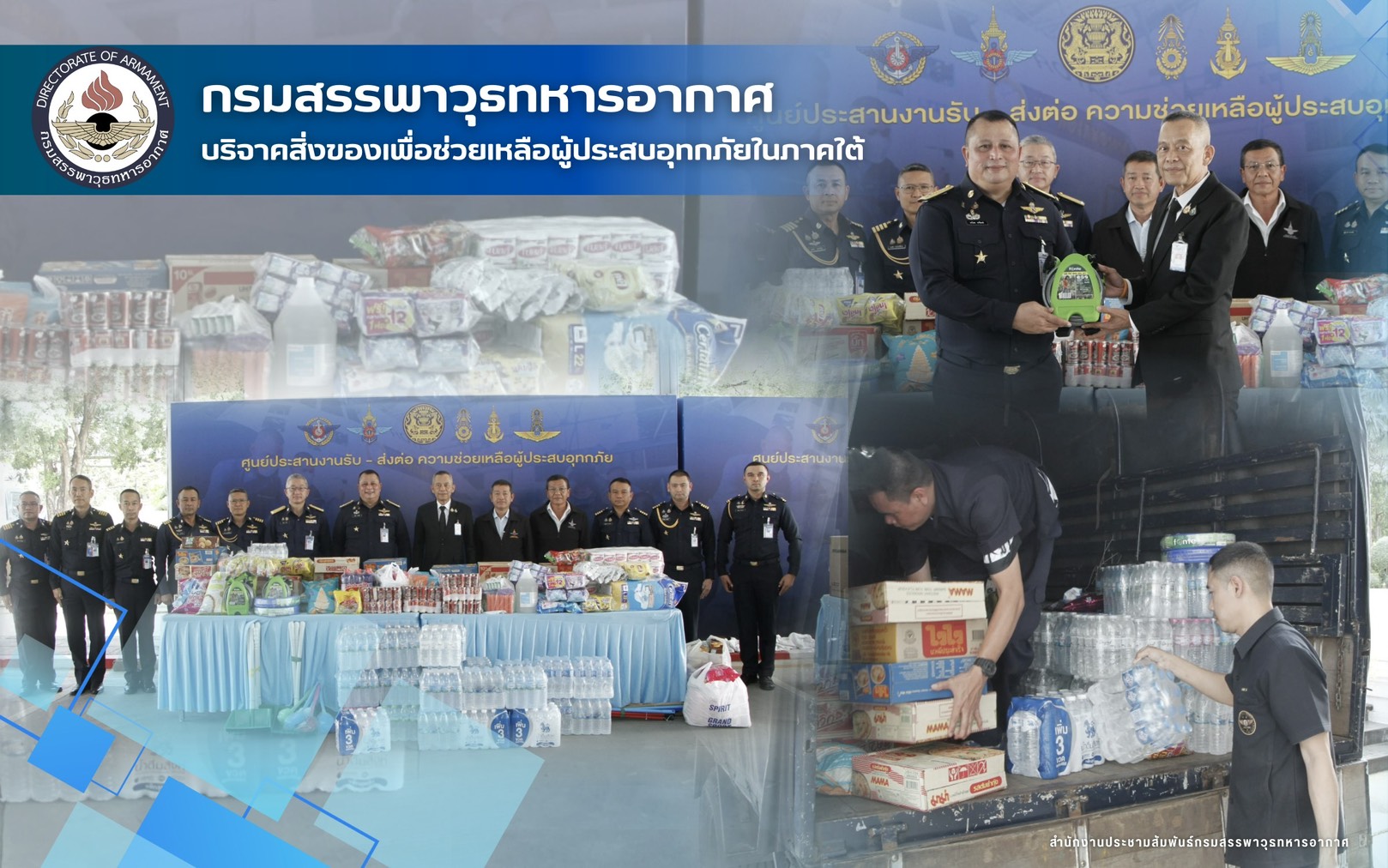 โดยกรมสรรพาวุธทหารอากาศ ได้ดำเนินการรวบรวมสิ่งของจากกำลังพล และผู้ประสงค์บริจาคที่กองโรงงานสรรพาวุธ 1 กรมสรรพาวุธทหารอากาศ เพื่อเป็นสื่อกลางในการบรรเทาความเดือดร้อนแก่พี่น้องประชาชน โดยได้นำความห่วงใยและกำลังใจส่งต่อไปยังผู้ประสบอุทกภัยในพื้นที่อำเภอหาดใหญ่ จังหวัดสงขลา เพื่อให้สามารถผ่านพ้นสถานการณ์ดังกล่าวไปได้โดยเร็ว