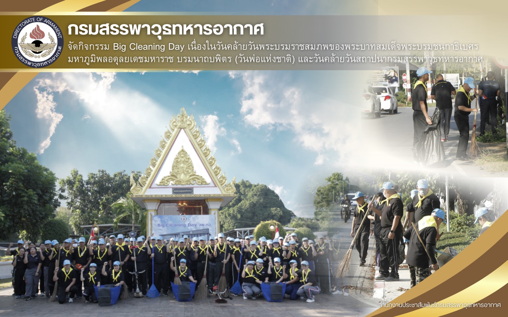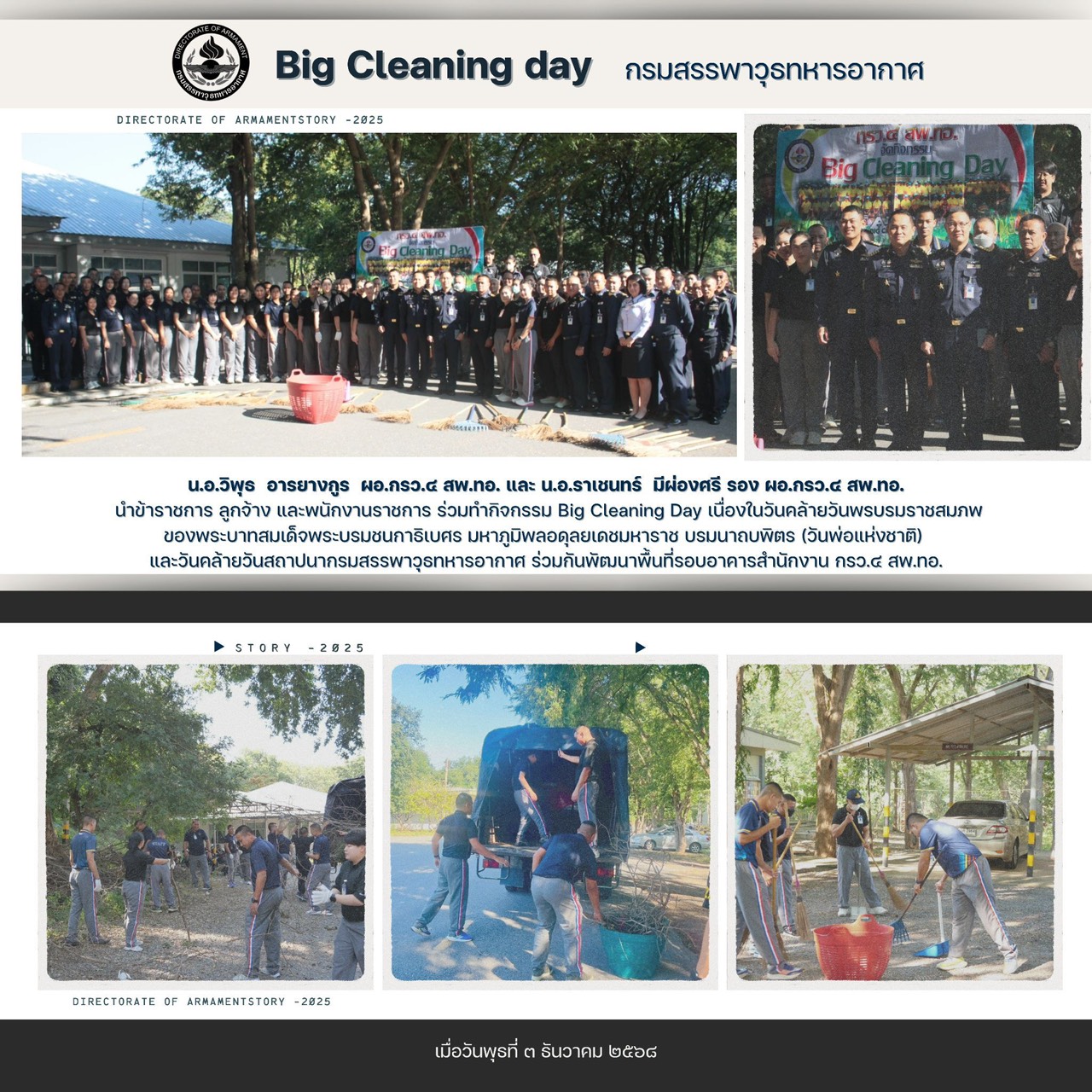 กรมสรรพาวุธทหารอากาศ จัดกิจกรรม Big Cleaning Day เนื่องในวันคล้ายวันพระบรมราชสมภพของพระบาทสมเด็จพระบรมชนกาธิเบศร มหาภูมิพลอดุลยเดชมหาราช บรมนาถบพิตร (วันพ่อแห่งชาติ) และวันคล้ายวันสถาปนากรมสรรพาวุธทหารอากาศ